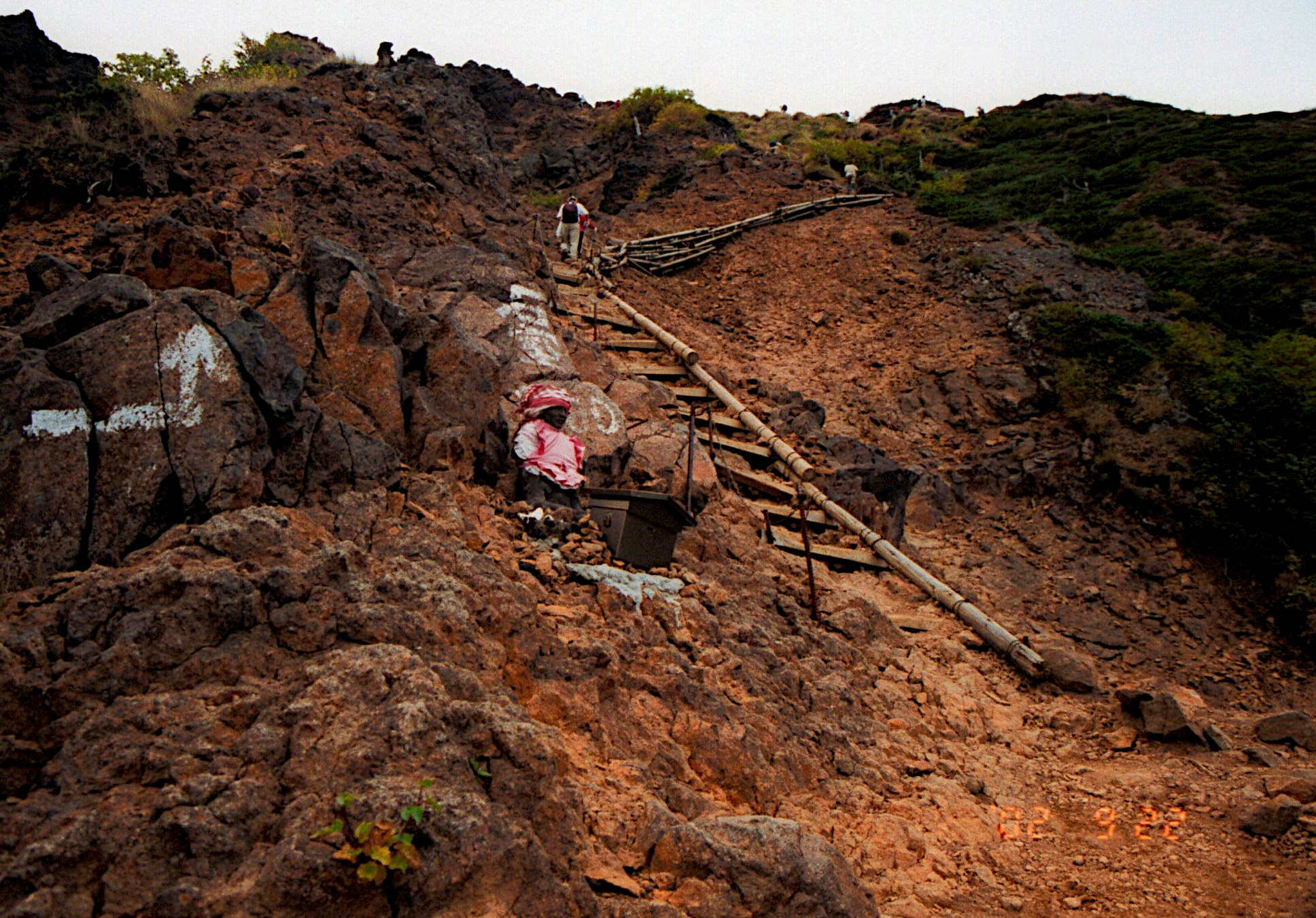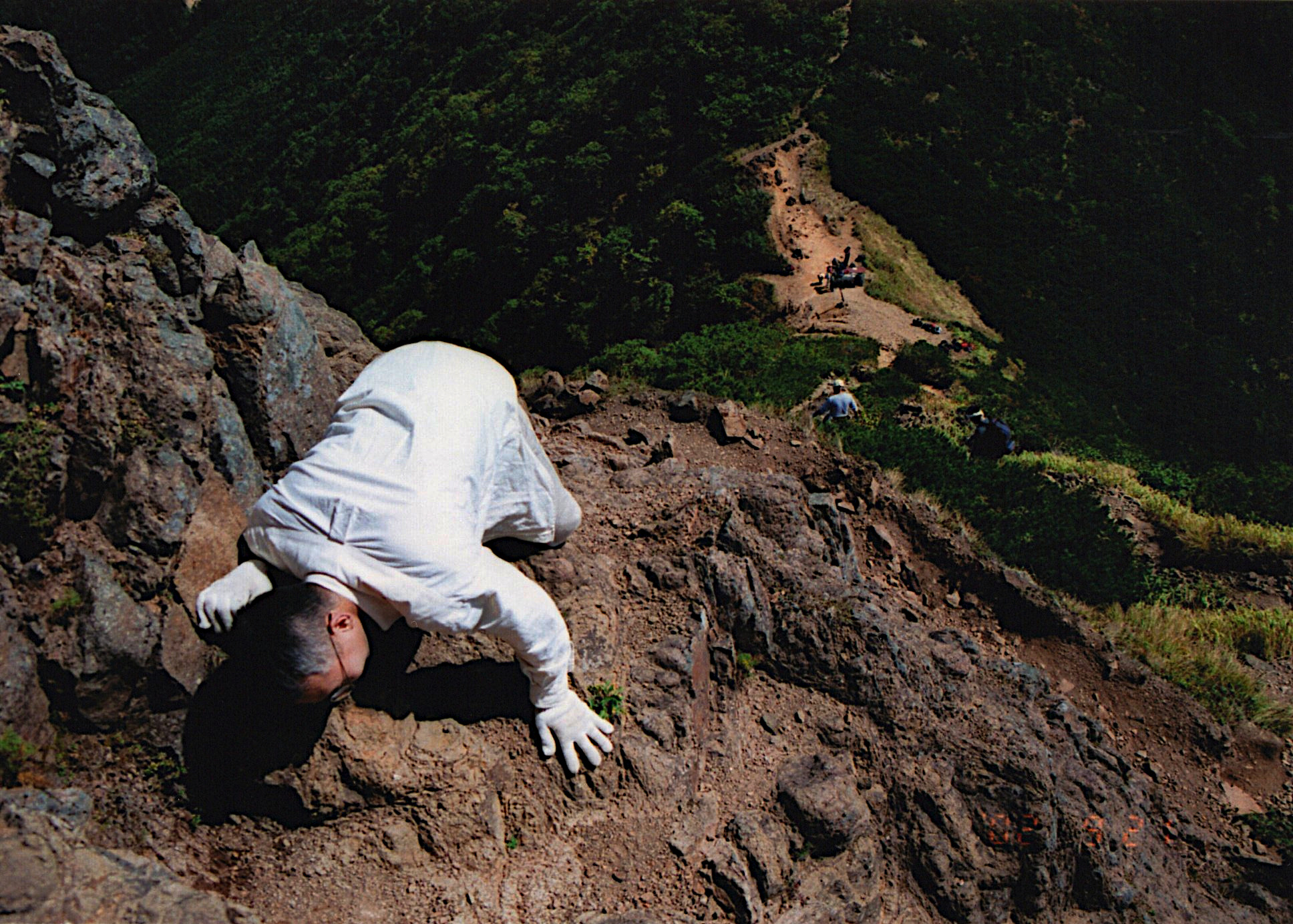 下から登って来る人と