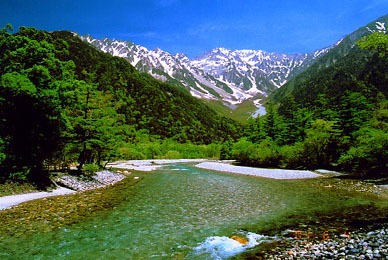 穂高連峰と梓川の景観。