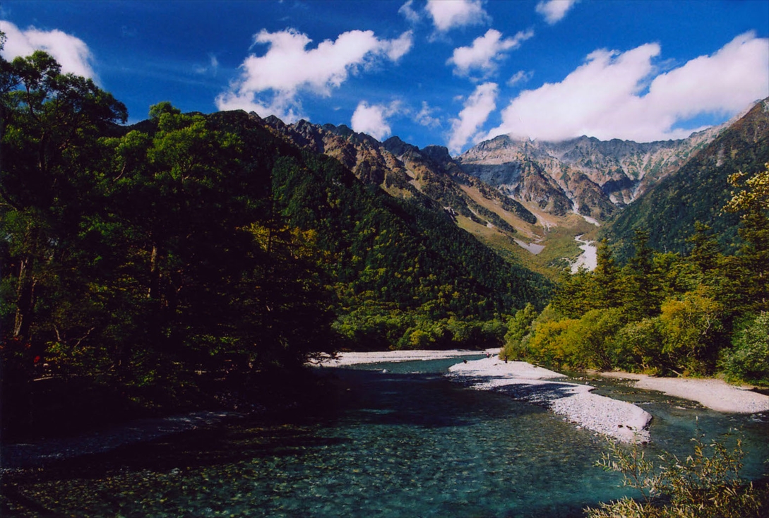 河童橋から穂高連峰を見ると、