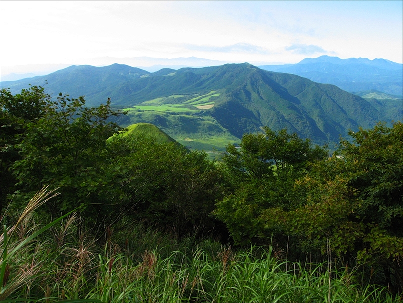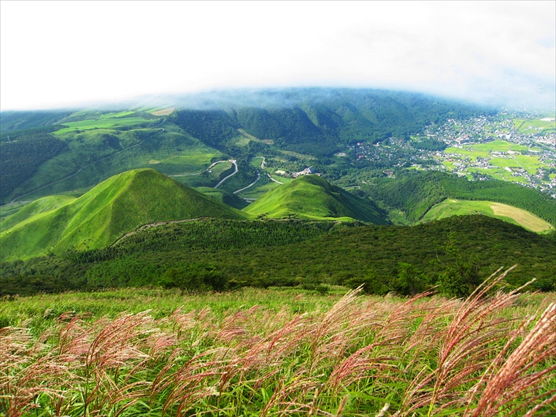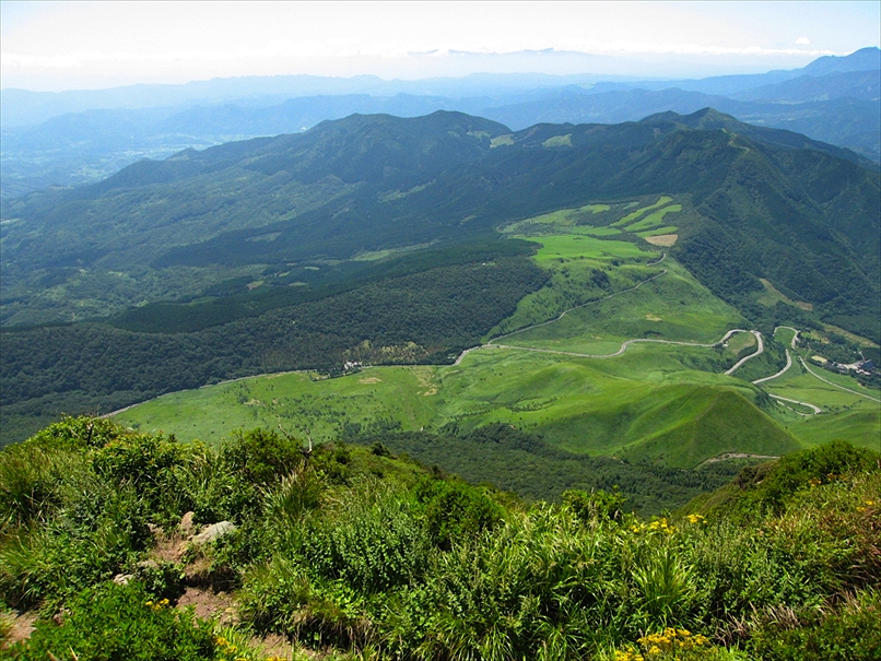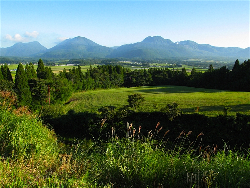瀬ノ本高原から阿蘇にかけて、牧草地の風景が美しい。