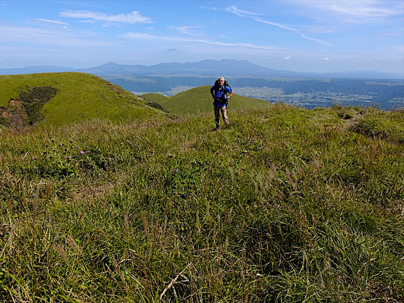 正面に見える阿蘇の山並みを見ながら
