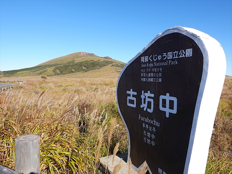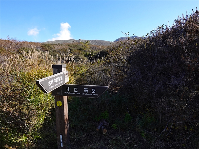 左手に古坊中の標識がある。 奥は杵島岳。