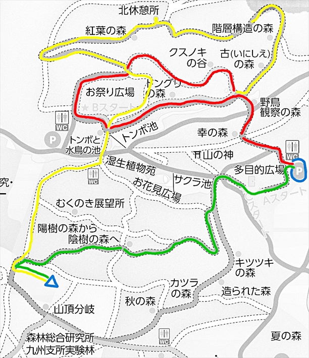 熊本市 立田山憩の森 −−−−−− 散策開始 −−−−−− 多目的広場駐車場 幸の森 ドングリの森 お祭り広場西側 クスノキの谷 階層構造の森 北休憩所 紅葉の森 お祭り広場東側 椋の木展望所西側 立田山山頂 陽樹の森から陰樹の森 サクラ池東端 管理センター 多目的広場駐車場 −−−−−− 散策完了 −−−−−− 立田山憩の森 熊本市 |