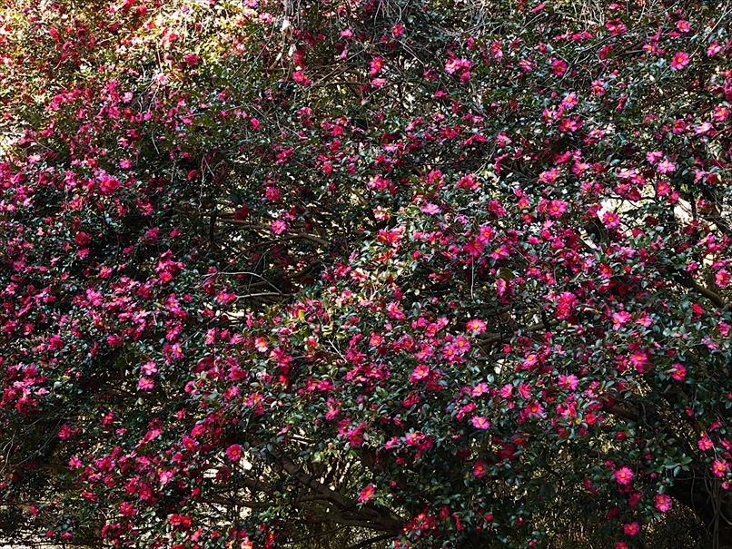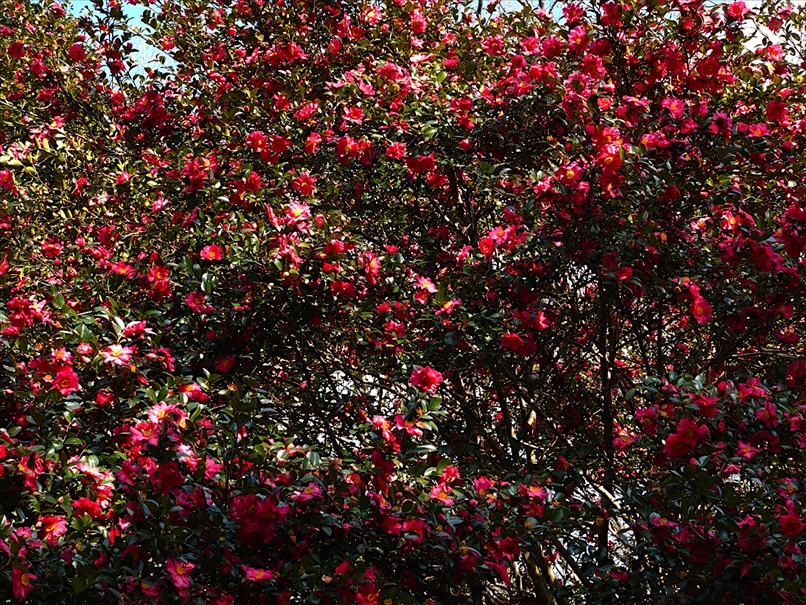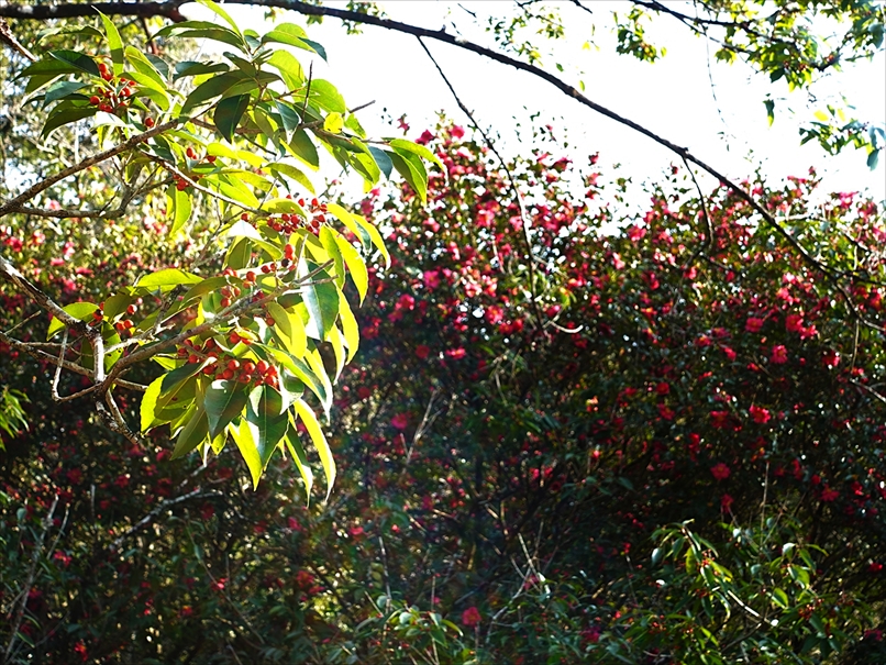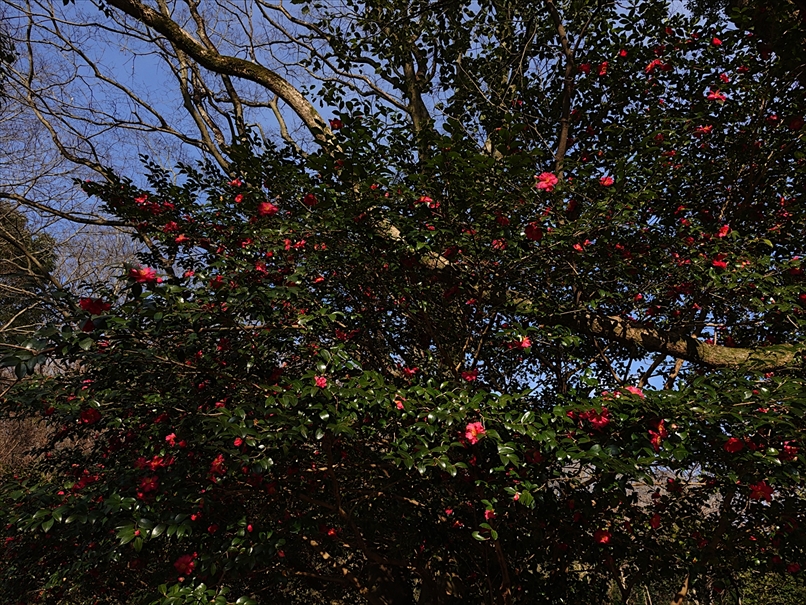 少し先に山茶花が垂れて咲いていて、