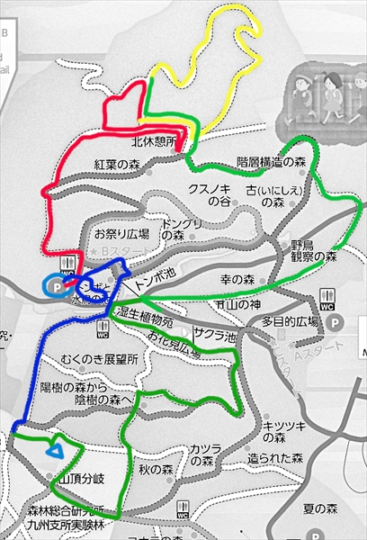 熊本市 お祭り広場駐車場 −−−−−− 散策開始 −−−−−− 北休憩所北西ルート 北休憩所 北休憩所北側エリア 階層構造の森 階層構造の森南東ルート 幸の森 トンボ池 お花見広場 陽樹の森から陰樹の森 山頂分岐 立田山山頂 山頂広場 北側直進ルート お祭り広場 細川さんの御茶屋跡 −−−−−− 散策完了 −−−−−− お祭り広場駐車場 熊本市 |