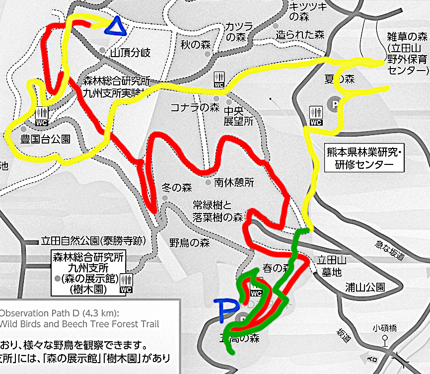 熊本市 五高の森駐車場 −−−−−− 散策開始 −−−−−− 五高の森 春の森 墓地側北上ルート 南休憩所 冬の森西側ルート 山頂広場 立田山山頂 豊国台公園南側ルート 中央展望所北側ルート 雑草の森 夏の森 夏の森駐車場 東側車道 春の森 花木の森 五高の森 −−−−−− 散策完了 −−−−−− 五高の森駐車場 熊本市 |