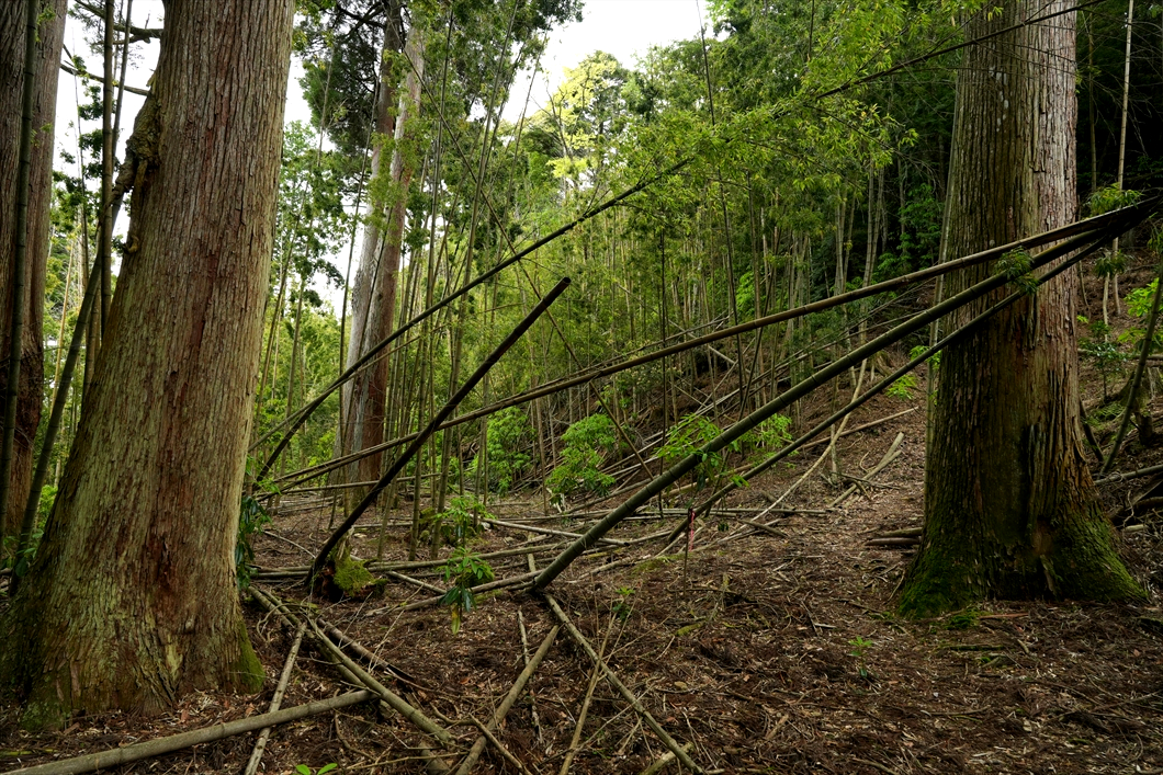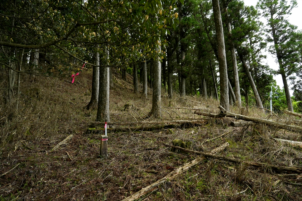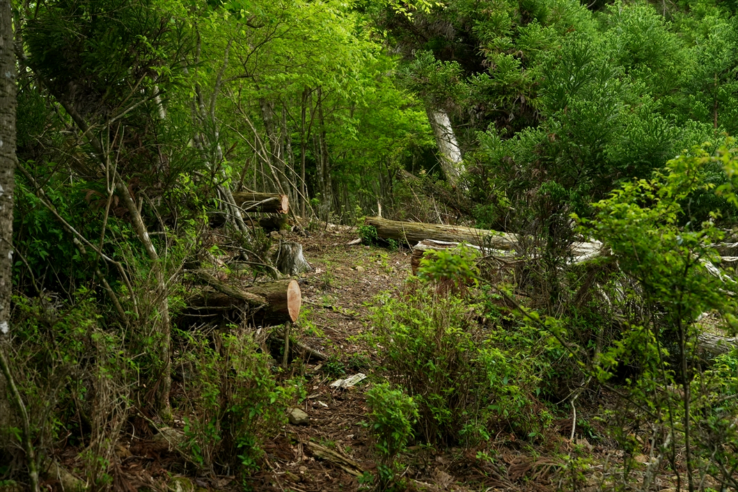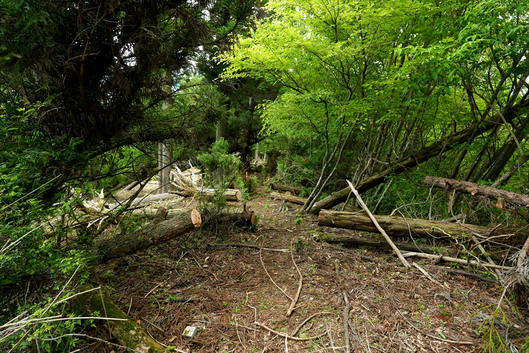 正面に見える倒木は、いつも大行寺山から