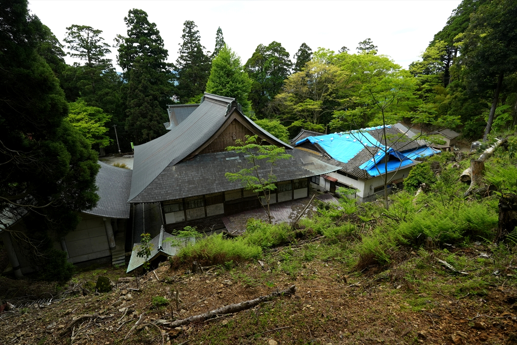 樹林の先に釈迦院の建物の屋根が見えている。