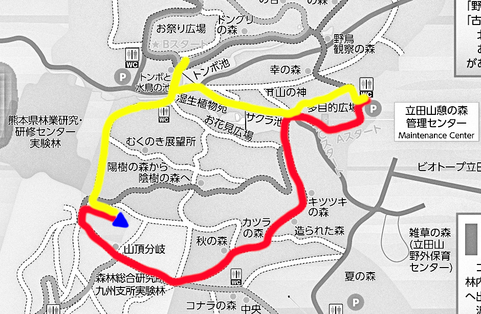 熊本市 多目的広場駐車場 −−−−−− 散策開始 −−−−−− 多目的広場駐車場 キツツキの森 秋の森 立田山山頂 お祭り広場 車道 多目的広場駐車場 −−−−−− 散策完了 −−−−−− 多目的広場駐車場 熊本市 |