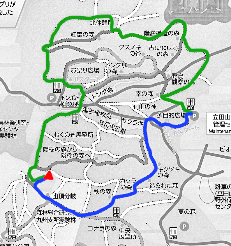 熊本市 多目的広場駐車場 −−−−−− 散策開始 −−−−−− 多目的広場駐車場 階層構造の森 北休憩所 お祭り広場 立田山山頂 山頂分岐 秋の森 キツツキの森 管理棟 多目的広場駐車場 −−−−−− 散策完了 −−−−−− 多目的広場駐車場 熊本市 |