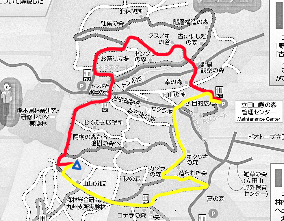熊本市 多目的広場駐車場 −−−−−− 散策開始 −−−−−− 多目的広場駐車場 クスノキの谷 お祭り広場 立田山山頂 山頂分岐 夏の森前車道 キツツキの森 多目的広場駐車場 −−−−−− 散策完了 −−−−−− 多目的広場駐車場 熊本市 |