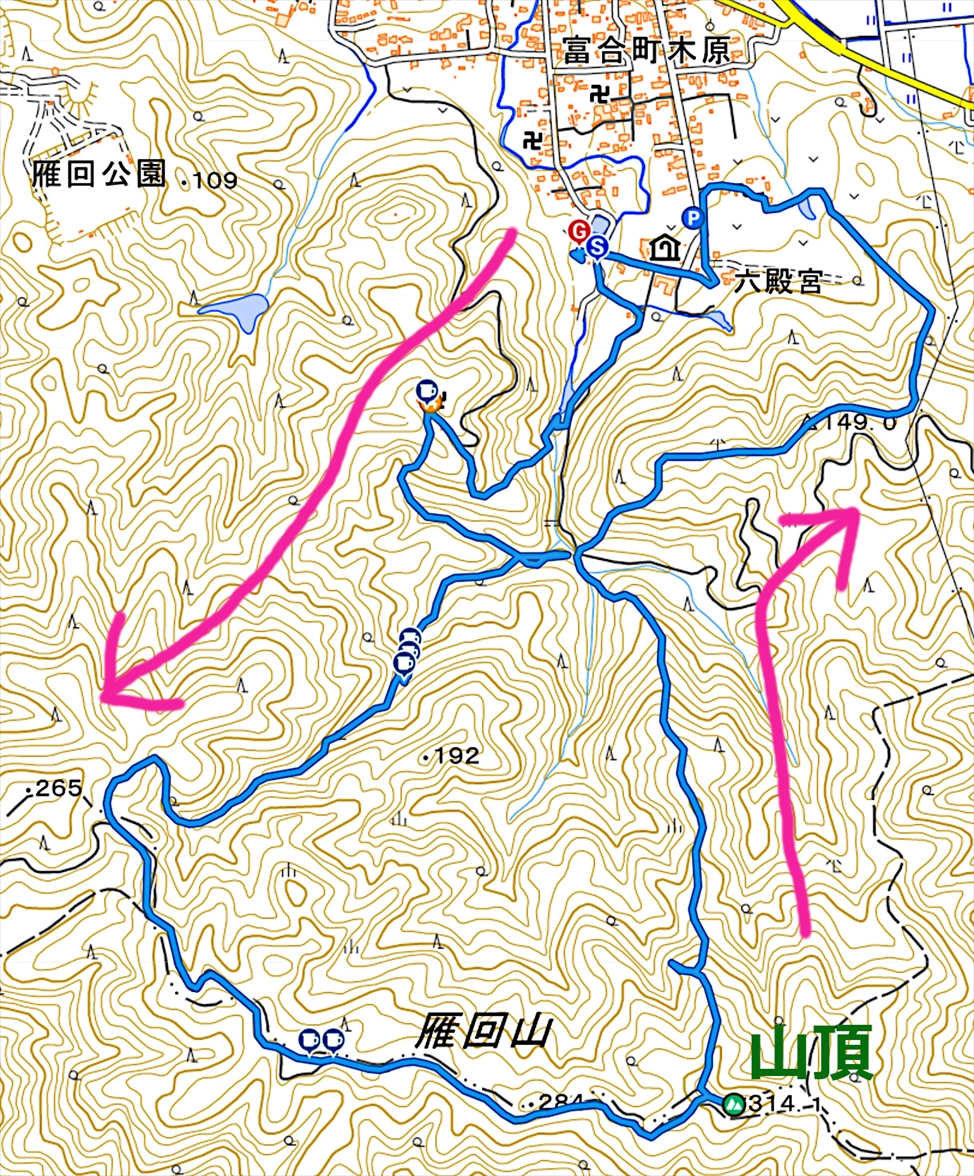 熊本市 木原まちの広場駐車場 −−−−−− 登山開始 −−−−−− 木原まちの広場駐車場 滝不動 奥の院 富合コース山道入り口 一ノ滝 東宮殿下御成婚記念碑コース 雁回公園コース 管理道 第一展望所 雁回山 山頂直登コース 宮山展望所 鉄塔側ルート 六殿神社 木原まちの広場駐車場 −−−−−− 登山完了 −−−−−− 木原まちの広場駐車場 熊本市 |