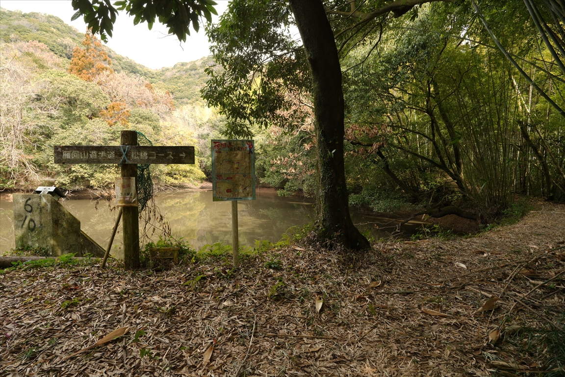 池の畔に道標と案内板。
