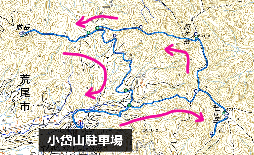 熊本市 小岱山駐車場 −−−−−− 登山開始 −−−−−− 小岱山駐車場 中央登山口 荒尾展望台 観音岳 唐渡岩 観音岳 筒ヶ岳 針の耳 前岳 小岱山駐車場 −−−−−− 下山完了 −−−−−− 小岱山駐車場 熊本市 |