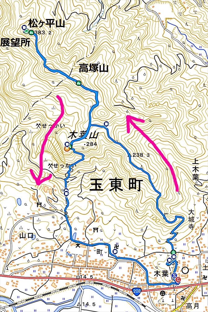 熊本市 玉東町役場 −−−−−− 登山開始 −−−−−− 玉東町役場駐車場 丸田公園 木葉山 高塚山 松ヶ平山 展望所 松ヶ平山 高塚山 木葉山 木葉小学校北側 玉東町役場駐車場 −−−−−− 登山完了 −−−−−− 玉東町役場 熊本市 |