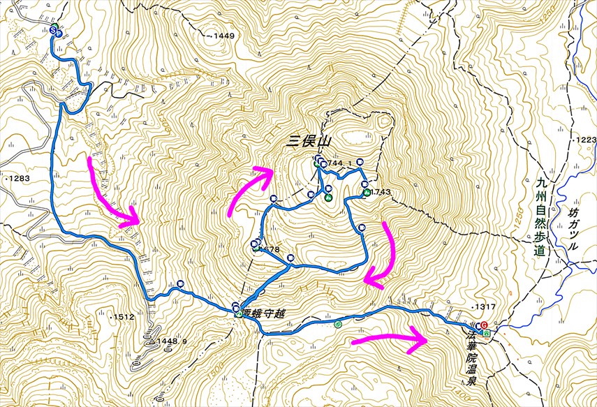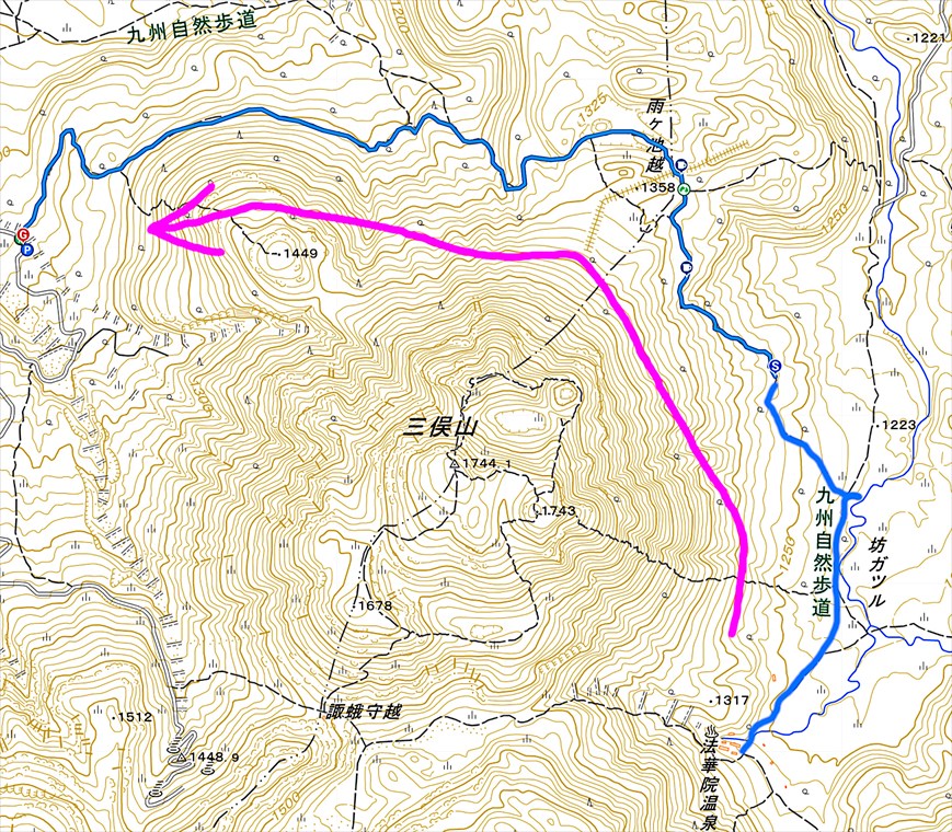 やまなみハイウェイ 長者原駐車場 指山自然探索路傍 駐車場 −−−−−− 登山開始 −−−−−− 指山自然探索路傍 駐車場 諏蛾守越 三俣山西峰 三俣山W峰 三俣山本峰 三俣山南峰 三俣山_南周り 諏蛾守越 法華院温泉山荘 −−−−−− 下山完了 −−−−−− 法華院温泉山荘 |
