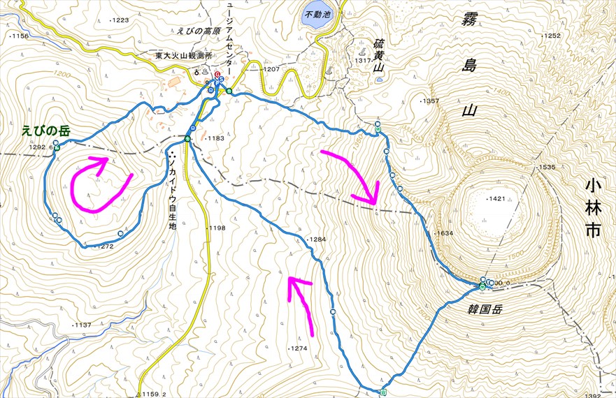 −−−−−− 登山開始 −−−−−− えびの高原駐車場 韓国岳登山口 硫黄山火口展望所 韓国岳 大浪池分岐 えびの高原駐車場 −−−−−− 下山完了 −−−−−− えびの高原駐車場 −−−−−− 登山開始 −−−−−− えびの岳県道側登山口 えびの岳展望所 えびの岳 えびの岳キャンプ村側登山口 えびの高原 温泉キャンプ村 えびの高原駐車場 −−−−−− 下山完了 −−−−−− えびの高原駐車場 道の駅 えびの えびの IC 九州自動車道 熊本市 |