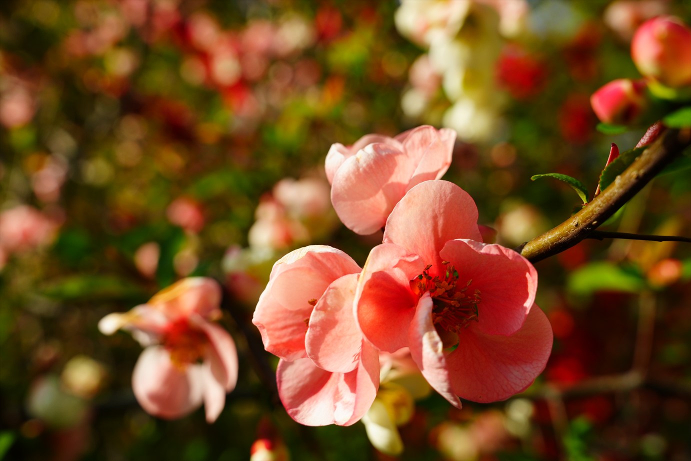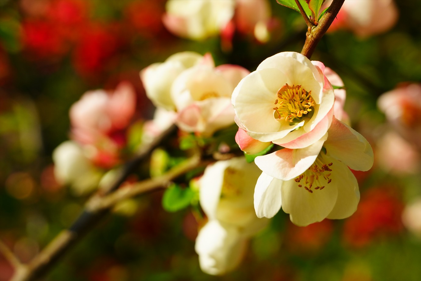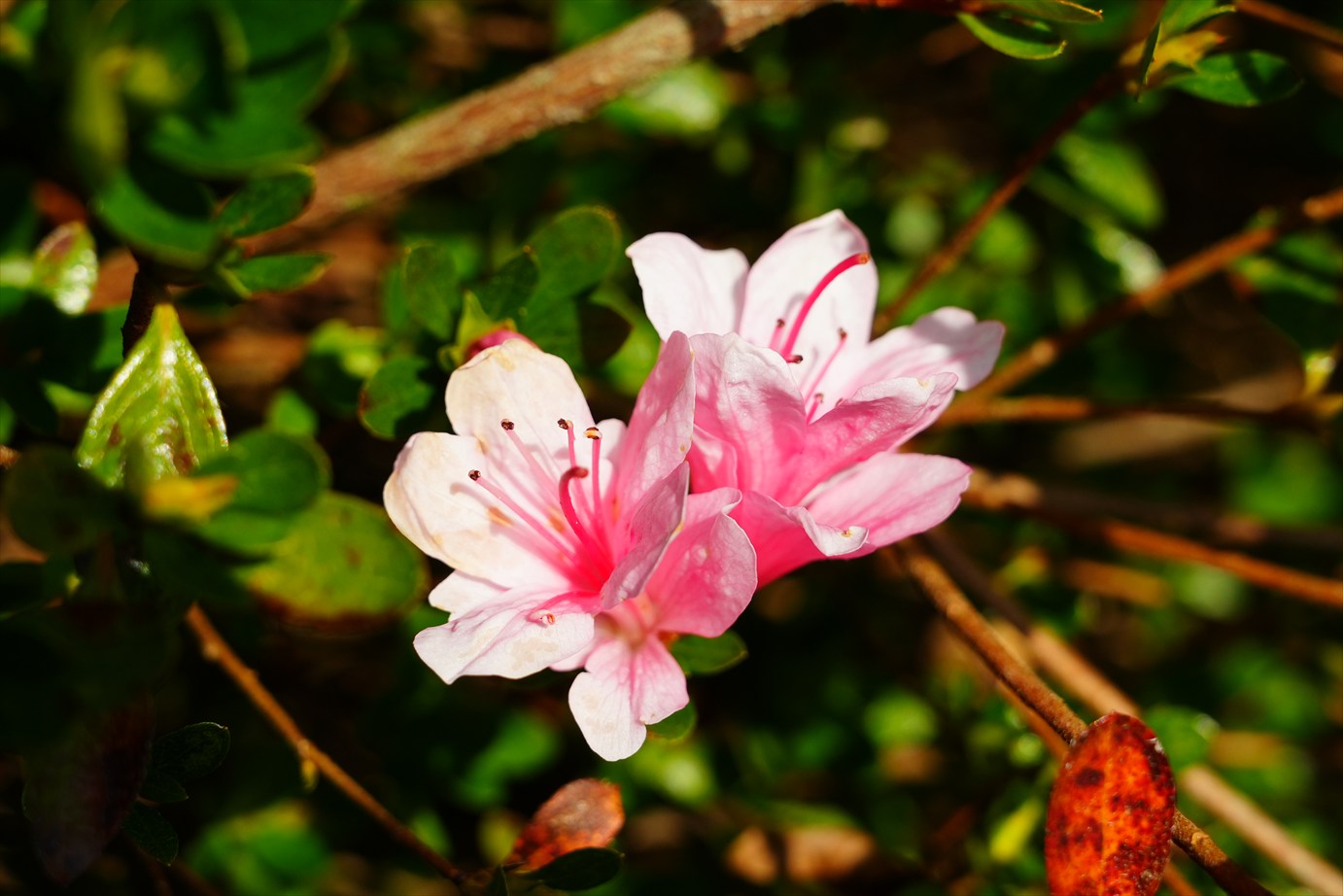 同じ枝に色違いの花が咲いてる。