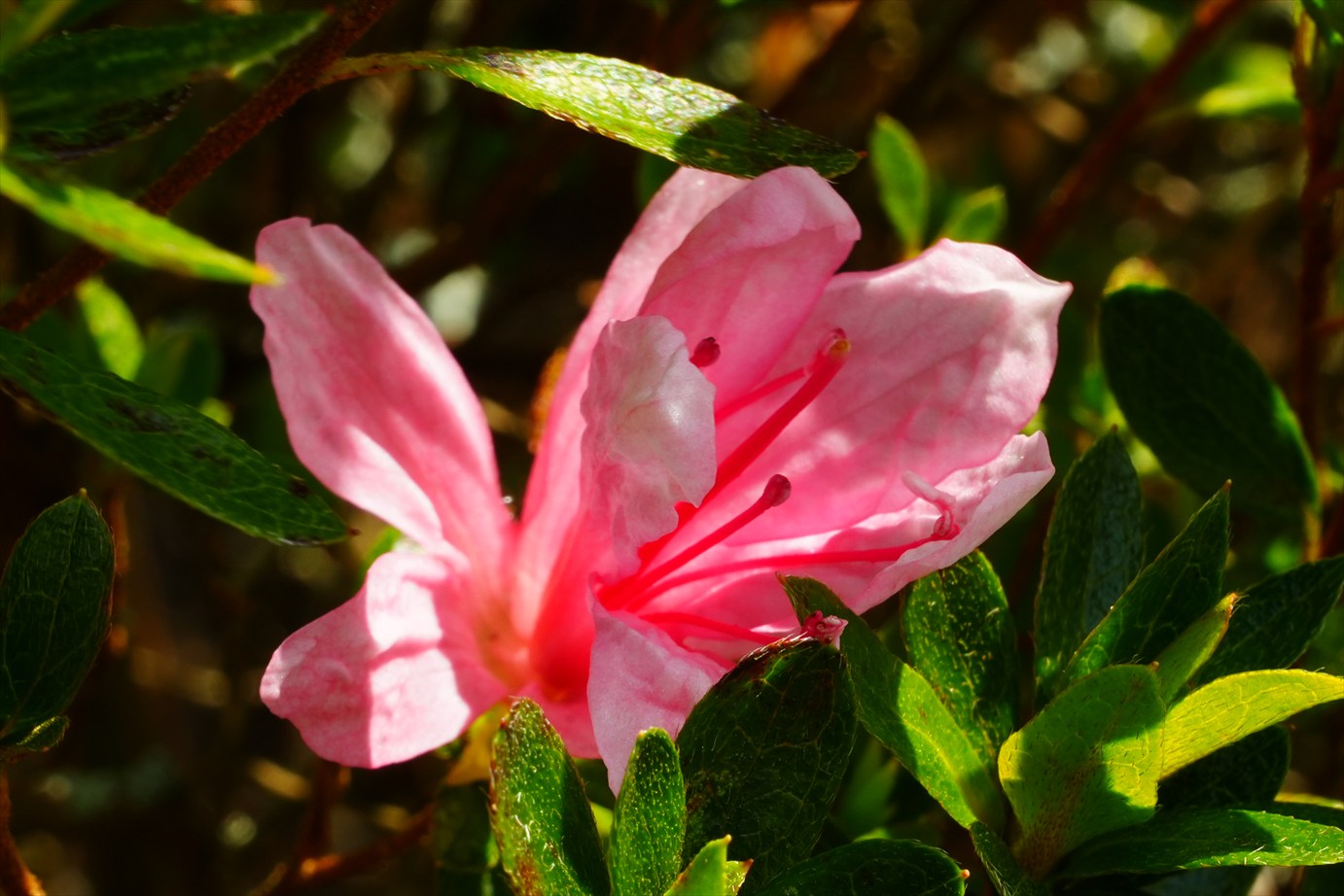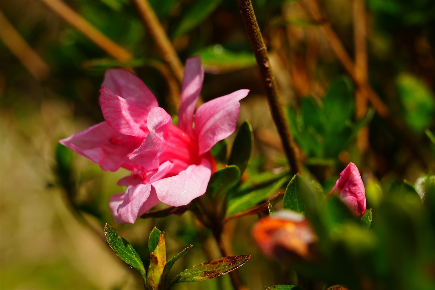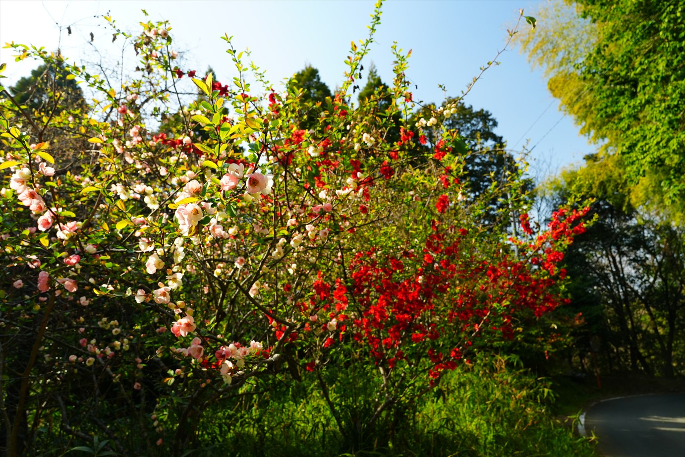 同じ枝に色違いの花が咲いてる。