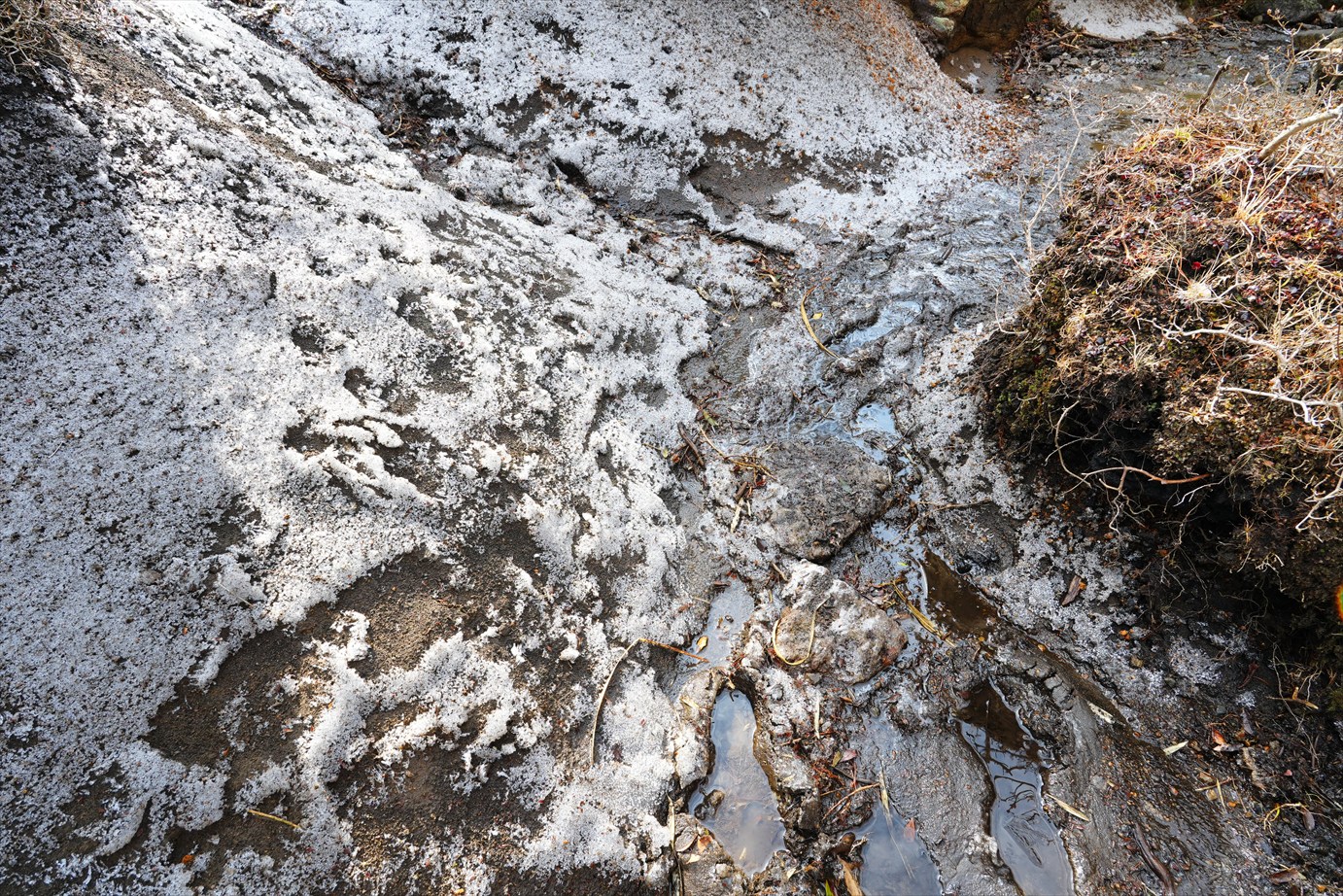 車道の反対側も霜だらけ〜