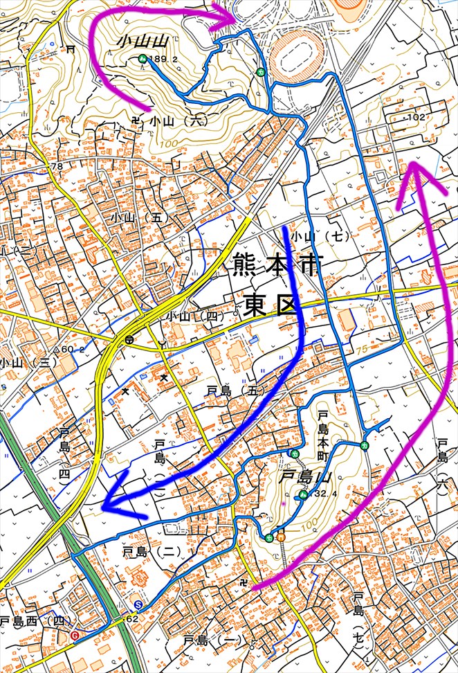 熊本市 戸島山西側展望所登り口 −−−−−− 登山開始 −−−−−− 戸島山西南側展望所登り口 戸島山 山頂 戸島山東側展望所登り口 −−−−−− 登山完了 −−−−−− 戸島山東側展望所登り口 県道 235 号線 総合運動公園 小山山 急登登り口 −−−−−− 登山開始 −−−−−− 小山山 急登登り口 小山山 山頂 小山山 東側登り口 総合運動公園 −−−−−− 登山完了 −−−−−− 総合運動公園 熊本市 |