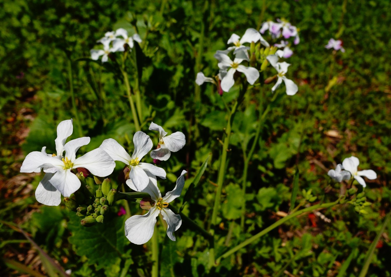 車道の反対側には大根の花。