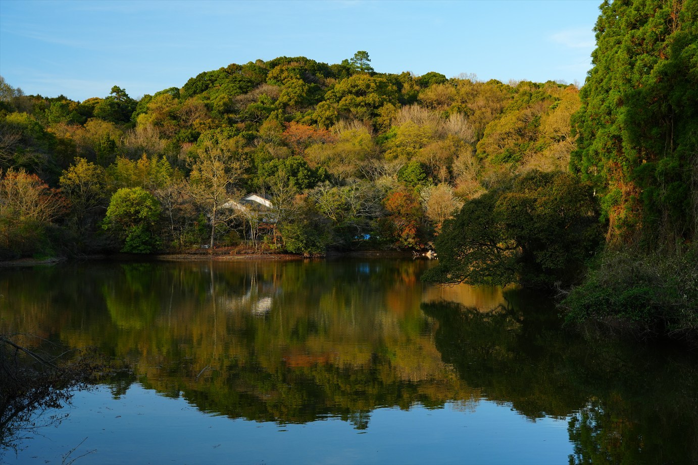 水面に樹木が映ってる。